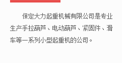 Introduction保定大力起重機械有限公司是專業(yè)生產(chǎn)手拉葫蘆、電動葫蘆、緊固件、滑車等一系列小型起重機械的公司。
